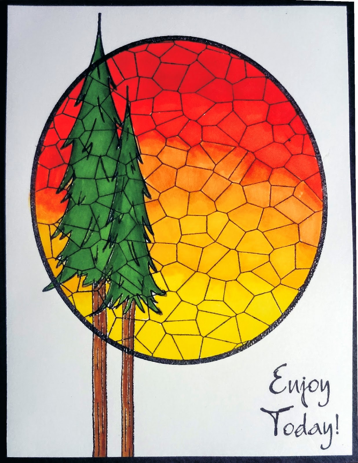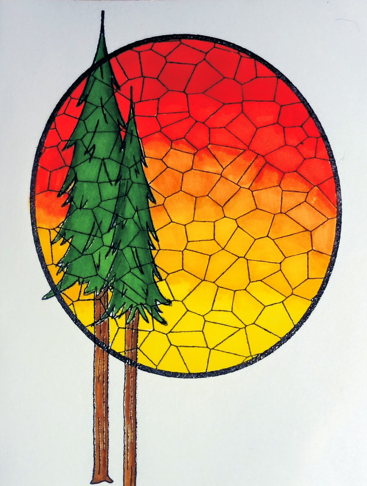 Now comes the fun part - coloring :) I started on the trees and then moved onto the sky starting with yellow on the bottom.